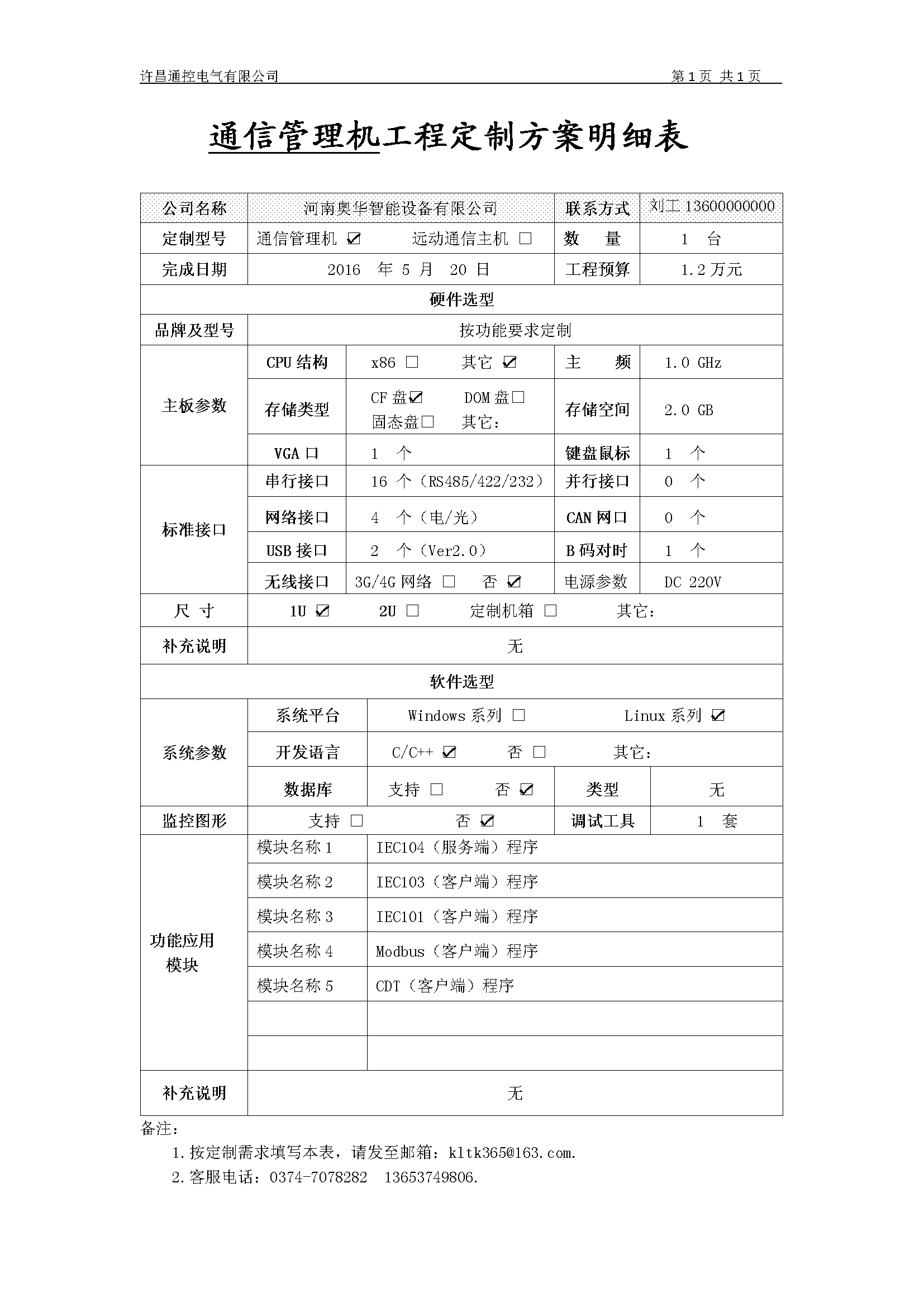 案例內(nèi)容:通信管理機(jī),工程中最復(fù)雜的功能單元;單獨(dú)開(kāi)發(fā),周期長(zhǎng),需耗大量人力、物力。本公司長(zhǎng)期從事通信管理機(jī)及相關(guān)產(chǎn)品的研制與開(kāi)發(fā),有專(zhuān)業(yè)、成熟的技術(shù)團(tuán)隊(duì)。您只管提出功能要求,或者提供您工程概況;我們會(huì)為你的工程量身裁剪,定制穩(wěn)定、可靠的管理機(jī)。 定制周期:約15 ~ 25個(gè)工作日(具體由工程決定)。 定制要求: 1、您可指定心儀的軟件結(jié)構(gòu)、硬件品牌及型號(hào)等;并可為貴公司定制LOGO標(biāo)識(shí)。 2、根據(jù)你的工程要求,請(qǐng)?zhí)顚?xiě)《工程定制模板》或《功能定制模板》,我們據(jù)此來(lái)定制可靠、經(jīng)濟(jì)的管理機(jī)。 3、我們承諾:設(shè)