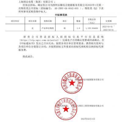 案例內(nèi)容:2023.02.14公司產(chǎn)品ZR-YJV-8.7/15KV、WDZ-YJY23-0.6/1KV成功中標(biāo)國網(wǎng),泗縣星悅尚城多能供應(yīng)服務(wù)電纜采購項(xiàng)目,中標(biāo)金額為11253946.5元