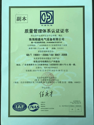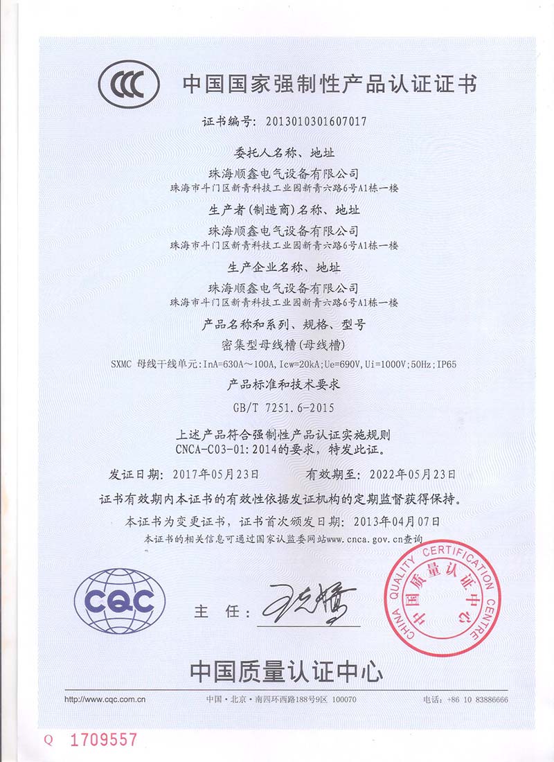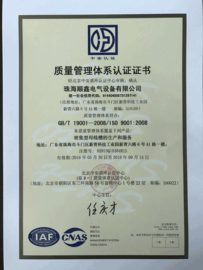 珠海順鑫電氣設備有限公司是從事高、低壓成套電氣設備、母線槽、智能電氣及輸配電設備的研發(fā)、生產、銷售安裝于一體的現代化高科技企業(yè)。公司主要產品包括:密集型母線槽、照明母線、耐火母線槽、高壓封閉式母線槽。公司產品品質通過國家強制性“3C”認證,全面實行嚴格的IS90001質量管理。滿足并適應不同工程項目的要求。 公司擁有完善的售前、售中、售后全方位的服務體系,公司遍布國內的服務網絡為您的項目提供及時周到的服務,而且我們還為您提供產品的技術培訓及指導安裝、通電調試、產品維護、回應投訴等服務、我們高素質的工程技術人員為您的項目提供一攬子專業(yè)解決方案和優(yōu)質、高效、快捷的服務。 公司以市場為導向,始終把“質量、價格、服務”三方面作為運營的重點,全面貫徹“全員參與、科學管理、持續(xù)發(fā)展,創(chuàng)順鑫品牌”的質量方針。以客戶為中心,努力為客戶創(chuàng)造價值,建立長期合作伙伴關系,攜手共創(chuàng)點擊查看