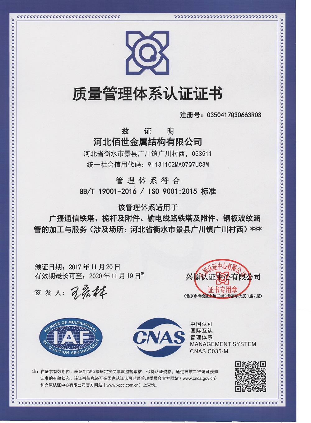河北佰世金屬結構有限公司是一家從事鐵塔的制作安裝為一體的大型專業(yè)生產型企業(yè),其中主要產品有通訊塔、避雷塔、監(jiān)控塔、工藝塔、交通標志桿、電力鐵塔以及各種鋼結構塔架廣泛用于中國電信、水利、電力、交通、軍工等行業(yè)。 公司占地15800平方米,建筑面積11500平方米,注冊資金11999萬元。具有獨立的法人資格、鋼結構三級承包資質、廣播通信鐵塔生產許可證、輸電線路鐵塔生產許可證。并通過了ISO9002國際質量管理體系、ISO14001環(huán)境管理體系及GB/T2800職業(yè)健康安全管理體系的認證。 公司以“人才為本,品牌為魂”的經營理念,不斷提升公司的品牌和戰(zhàn)略價值。以“一流的技術、一流的品質”為目標,堅持技術進步,持續(xù)改進產品質量。以“追求品質、誠心誠意”為宗旨,竭誠為廣大客戶提供優(yōu)質的產品、優(yōu)惠的價格和優(yōu)良的服務。 我們以“質量第一、信譽第一、用戶至上”為企業(yè)的根本宗旨。愿把一流的產品帶給您,一流的服務帶給您,并真誠期待點擊查看