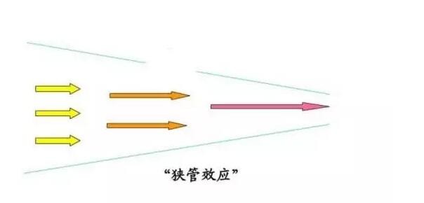 當(dāng)氣流由開闊地帶流入地形構(gòu)成的峽谷時(shí),由于空氣質(zhì)量不能大量堆積,于是加速流過峽谷,風(fēng)速增大。當(dāng)流出峽谷時(shí),空氣流速又會(huì)減緩。這種峽谷地形對(duì)氣流的影響,稱為“狹管效應(yīng)”或“峽谷效應(yīng)”。