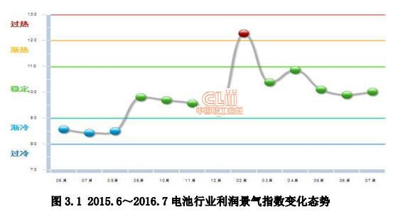 2016年7月電池利潤(rùn)景氣指數(shù)為100.17,較5月的98.96上漲1.21個(gè)百分點(diǎn)。