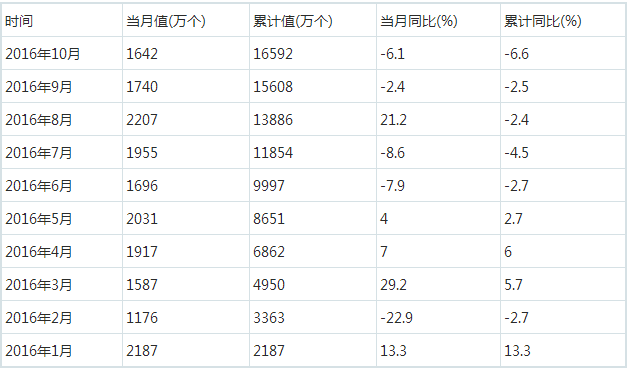 前瞻產(chǎn)業(yè)研究院數(shù)據(jù)顯示,2016年10月全國(guó)鉛酸蓄電池出口量為1642萬(wàn)個(gè),同比下降6.1%。1-10月累計(jì)出口量為16592萬(wàn)個(gè),同比下降6.6%。以下為2016年1-10月全國(guó)鉛酸蓄電池出口量數(shù)據(jù)統(tǒng)計(jì):