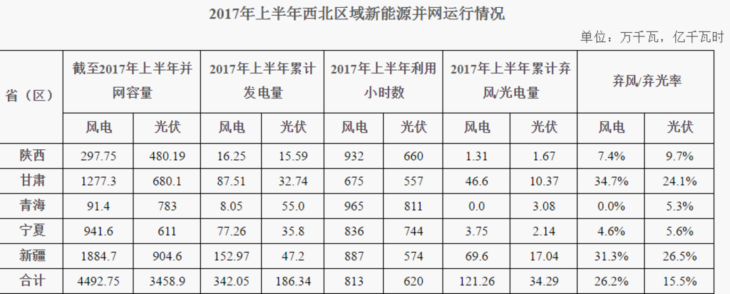2017年上半年,西北五?。▍^(qū))新增光伏發(fā)電并網(wǎng)容量422.49萬千瓦,截至2017年上半年,累計并網(wǎng)容量3458.9萬千瓦,占全網(wǎng)總裝機的13.88%。2017年上半年,光伏發(fā)電量186.34億千瓦時,占全網(wǎng)總發(fā)電量的5.61%;利用小時數(shù)620小時,棄光電量34.29億千瓦時,棄光率15.5%。西北及五?。▍^(qū))棄光率依次為:陜西9.7%、甘肅24.1%、青海5.3%、寧夏5.6%、新疆26.5%。