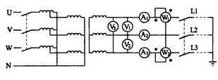以上各式中,U11,U12,U13:電壓表V1,V2,V3的讀數(shù),測量的值均為線電壓。I11,I12,I13:電流表A1,A2,A3的讀數(shù),測量的值均為每一相的電流。P1,P2:功率表W1,W2的讀數(shù)。