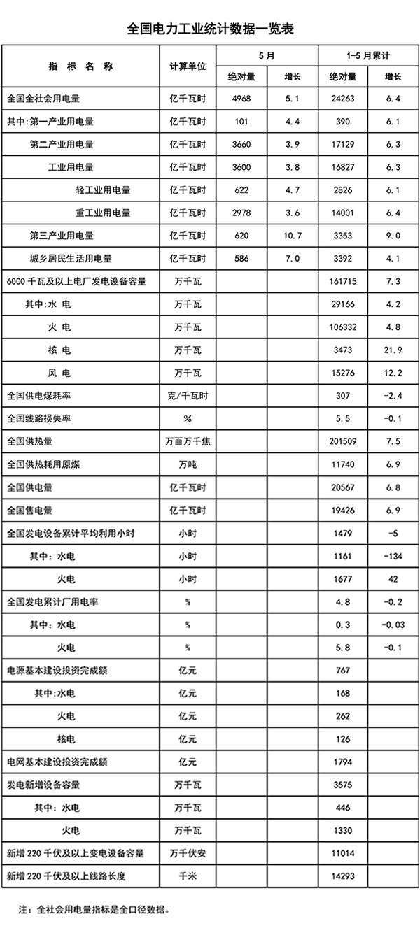 6月16日,國(guó)家能源局發(fā)布1-5月份全國(guó)電力工業(yè)統(tǒng)計(jì)數(shù)據(jù)。其中包含全國(guó)全社會(huì)用電量、第一產(chǎn)業(yè)用電量、第二產(chǎn)業(yè)用電量,工業(yè)用電量等
