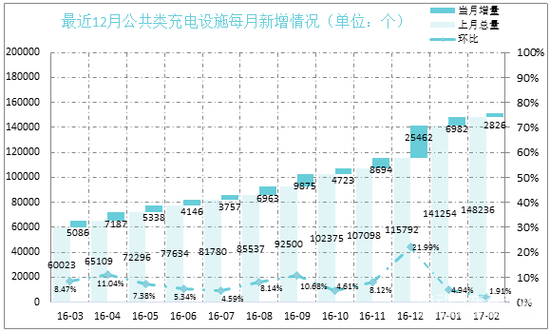 據(jù)了解,截至2017年2月,中國(guó)電動(dòng)汽車充電基礎(chǔ)設(shè)施促進(jìn)聯(lián)盟內(nèi)成員單位總計(jì)上報(bào)公共類充電樁151062個(gè),其中交流充電樁54919個(gè)、直流充電樁38490個(gè)、交直流一體充電樁57653個(gè),2017年2月較2017年1月新增公共類充電樁2826個(gè)。從2016年3月到2017年2月,月均新增公共類充電設(shè)施約7587個(gè),2017年2月同比增長(zhǎng)151.7%。實(shí)際每月新增公共類充電設(shè)施及環(huán)比數(shù)據(jù)如下圖所示: