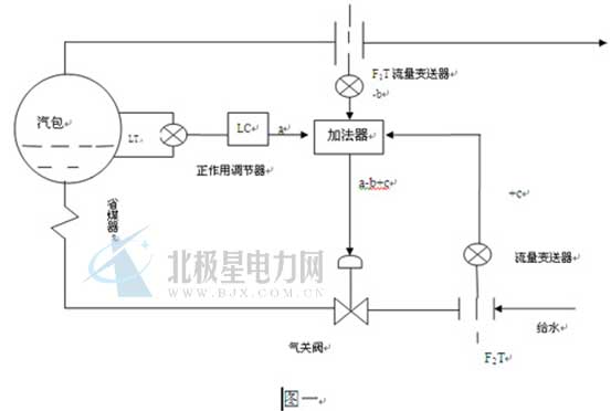 設計K2I2 =K3I3此時I0正是調(diào)節(jié)閥處于正常開度時所需的電流信號。假定在某一時刻,蒸汽負荷突然增加,蒸汽流量變送器的輸出電流I2相應增加,加法器的輸出電流I0就減少,從而開大給水調(diào)節(jié)閥。與此同時出現(xiàn)了虛假液位現(xiàn)象。液位調(diào)節(jié)器輸出電流I1將增大。由于進入加法器的兩個信號相反,蒸汽流量變送器的輸出電流I1 會抵消一部分假液位輸出電流I2 ,所以虛假液位所帶來的影響將局部或全部被克服。