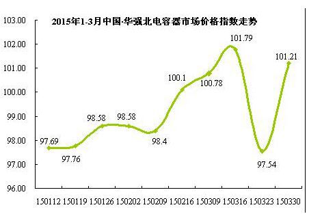 數(shù)據(jù)顯示,2015年3月中國˙華強(qiáng)北電容器市場月均價格指數(shù)為100.33點,1-3月中國˙華強(qiáng)北電容器市場月均價格指數(shù)為99.24點,高于1-2月的月均值。