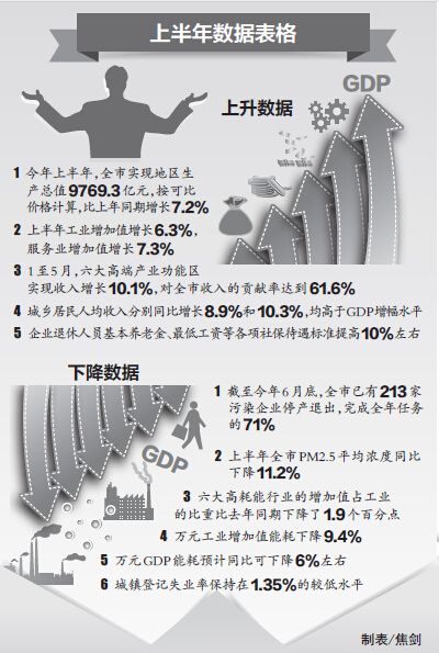 2014年上半年,全市實現(xiàn)地區(qū)生產(chǎn)總值9769.3億元,按可比價格計算,比2013年同期增長7.2%。