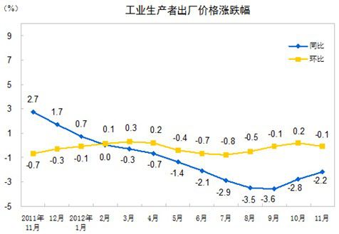 2012年11月份,全國工業(yè)生產(chǎn)者出廠價(jià)格同比下降2.2%,環(huán)比下降0.1%。工業(yè)生產(chǎn)者購進(jìn)價(jià)格同比下降2.8%,環(huán)比下降0.2%