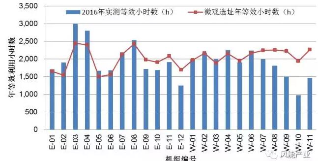 評估結(jié)果顯示,各機(jī)組2016年實測年等效利用小時數(shù)與微觀選址計算的年等效利用小時數(shù)對比如圖1所示。