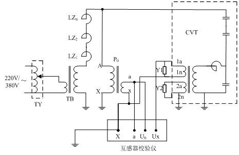 TY-調(diào)壓控制箱;TB-激勵變壓器;P0-標(biāo)準(zhǔn)電壓互感器;Y1,Y2-電壓負荷箱;CVT-被試電容式電壓互感器 現(xiàn)場試驗的一般接線圖如圖1示。試驗設(shè)備主要有標(biāo)準(zhǔn)電壓互感器、調(diào)壓器、激勵變壓器、可調(diào)電抗器、電壓負荷箱