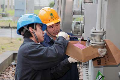 3月26日,富陽(yáng)市供電局2名運(yùn)行人員正在為110千伏長(zhǎng)春變更換主變硅膠。這是該局第一次由運(yùn)行人員獨(dú)立完成的設(shè)備消缺操作