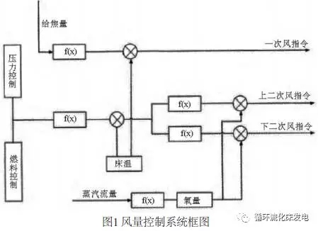 目前的風(fēng)量控制系統(tǒng)就是基于上述原理實現(xiàn)的。如圖1所示,總風(fēng)量指令經(jīng)過一、二次風(fēng)量配比后由鍋爐床溫修正。蒸汽流量函數(shù)生成氧量指令,并經(jīng)氧量調(diào)節(jié)器修正,分兩路輸出上、下二次風(fēng)指令。以遠(yuǎn)程控制的方式實現(xiàn)對CFB鍋爐煤量、風(fēng)量的調(diào)整和控制,進(jìn)而保證鍋爐在各負(fù)荷工況下的安全、穩(wěn)定、高效運行。