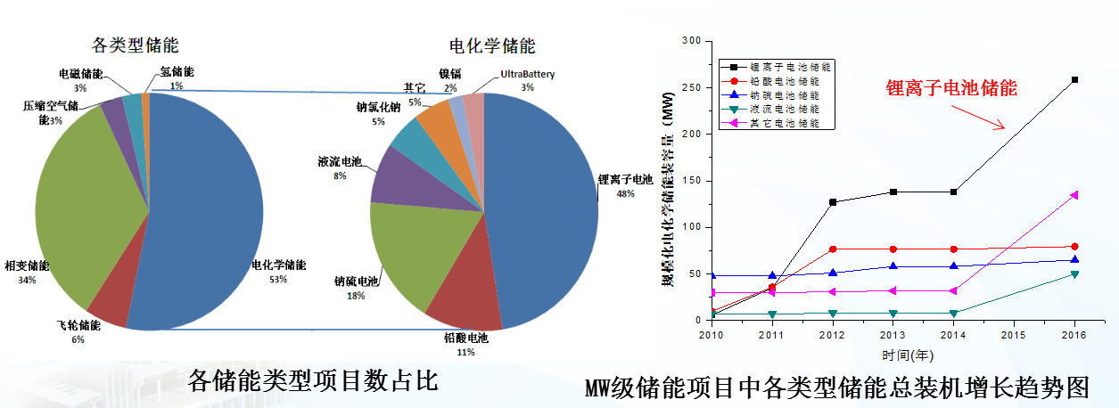 上邊的數(shù)據(jù),不難看出儲(chǔ)能的裝機(jī)容量近5年之內(nèi)幾乎是翻番的,尤其是2015年―2016年,2015年的時(shí)候只有100兆瓦,到2016年已經(jīng)到了300兆瓦,增幅很快,當(dāng)然和社會(huì)各界的努力有關(guān)系,電網(wǎng)公司也做了很大的貢獻(xiàn)。
