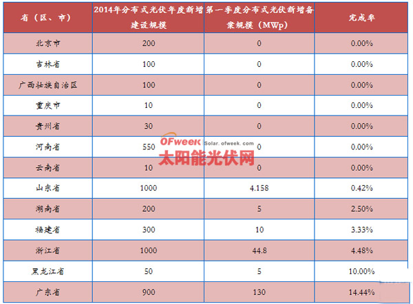 山東作為分布式光伏發(fā)展大省,2014年第一季度新增分布式備案容量僅0.415萬千瓦,約占年度規(guī)模的0.42%。此外,浙江省2014年度分布式光伏建設(shè)指導規(guī)模為100萬千瓦,而第一季度僅新增備案4.48萬千瓦;廣東第一季度分布式光伏建設(shè)情況較好,但新增備案容量也僅有13萬千瓦。