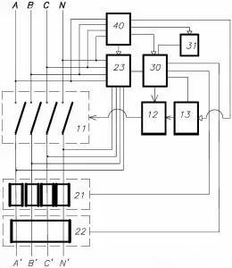 所述的信號交互模塊31包括液晶顯示電路、工作狀態(tài)的指示電路、按鍵輸入電路和通訊接口電路。所述的電流檢測模塊21和漏電檢測模塊22分別采用電流互感器和零序電流互感器。所述的電源模塊40包括三相整流電路和分壓電路,三相整流電路從主電路的輸入端A、B、C、N取電,分壓電路分別向電壓檢測模塊23、電動重合閘機構13的電機、信號交互模塊31和控制單元30提供適配的直流電壓。所述的電流檢測模塊21和漏電檢測模塊22采集的各相電流信號包括短路電流信號、過載電流信號和剩余電流信號。