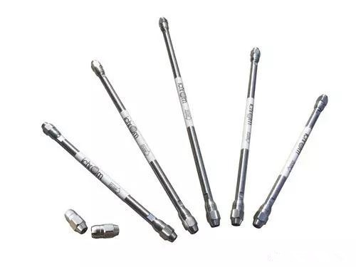 對于第二種情況,擰開柱頭,檢查柱填料是否硬結(jié)或塌陷。去除硬結(jié)部分(污染的填料),裝入新填料,滴一滴甲醇,填料下陷,再填,用與柱內(nèi)徑相同的頂端平滑的不銹鋼桿壓緊,再填平,滴甲醇,再壓緊反復(fù)幾次,直至裝滿填平。柱頭用甲醇沖洗干凈,擦凈柱外壁的填料,擰緊柱頭,用純甲醇沖洗30分鐘以上。