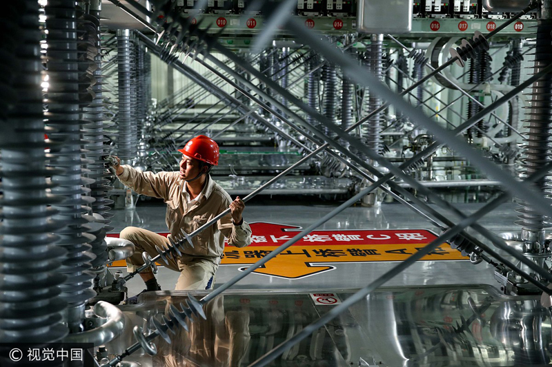 2017年10月12日,江蘇蘇州,電力作業(yè)人員正在“電網(wǎng)紅綠燈”蘇州南部電網(wǎng)500千伏統(tǒng)一潮流控制(UPFC)示范工程閥廳內(nèi)進(jìn)行換流閥調(diào)試作業(yè)。當(dāng)日,位于江蘇蘇州的500千伏“統(tǒng)一潮流控器”UPFC示范工程進(jìn)入電氣調(diào)試收尾階段,并同步進(jìn)行竣工預(yù)驗收