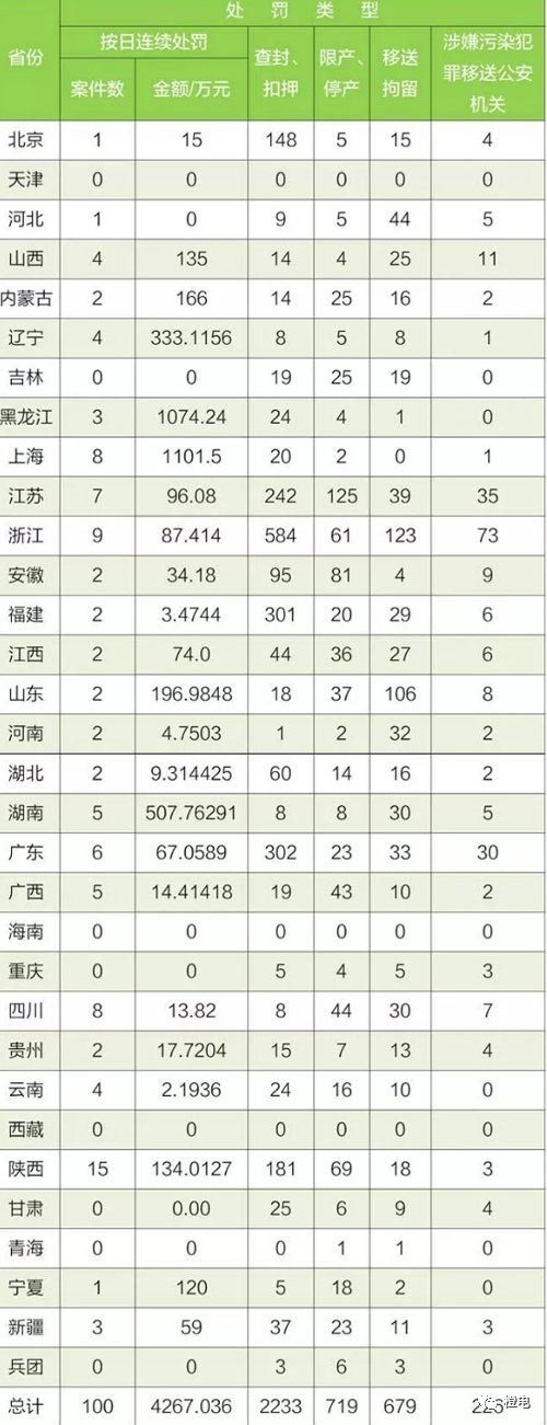 其中,按日連續(xù)處罰案件100件,比去年增長49%;查封、扣押案件2233件,比去年增長321%;限產(chǎn)、停產(chǎn)案件719件,比去年增長99%;移送行政拘留679起,比去年增長114%;移送涉嫌環(huán)境污染犯罪案件226件,比去年增長55%。