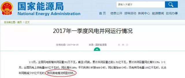 昨天,國家能源局發(fā)布了2017年第一季度的風電并網運行情況:“1-3月,全國風電上網電量687億千瓦時,同比增長26%;平均利用小時數468小時,同比增加46小時;棄風電量135億千瓦時,比去年同期減少57億千瓦時,棄風限電情況明顯好轉。” (來源:微信公眾號“能源大嘴” ID:goodenergy 作者:孟琦) 來自國家能源局官網截圖 棄風限電情況真的有“明顯好轉”